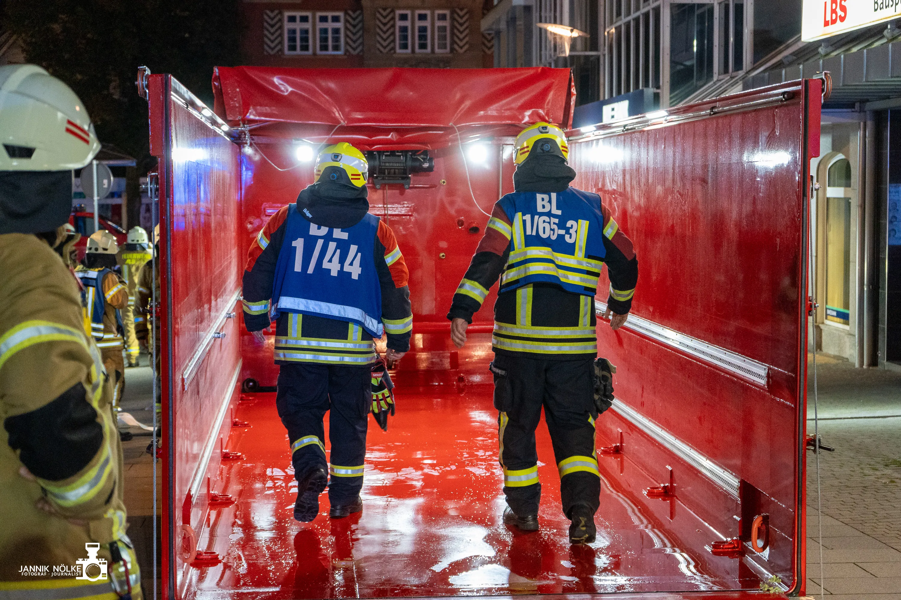 Die Feuerwehr Albstadt, Abteilung Ebingen übt zusammen mit der Partner-Wehr aus Balingen in der Ebinger Innenstadt.